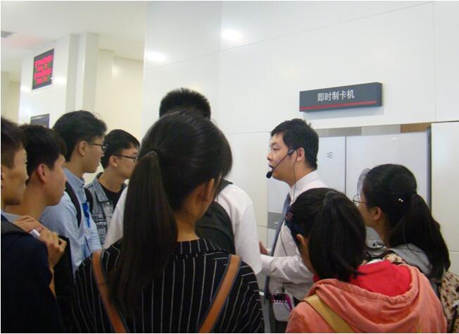 为了参观这家智能银行,yl6776永利集团谭小芬副经理与在中国工商银行工作的贡烨员工联系,经过多次协商确定了参观事项。当左老师和同学们进入智能银行时,李可行长和团委书记韩博文早已等候在业务大厅。李可行长亲自担纲,向同学们逐一详细介绍智能银行系统的各个构成部分,李行长生动的讲解引发了大家极大的兴趣,当场就有几位同学尝试利用智能银行办理借记卡等业务。