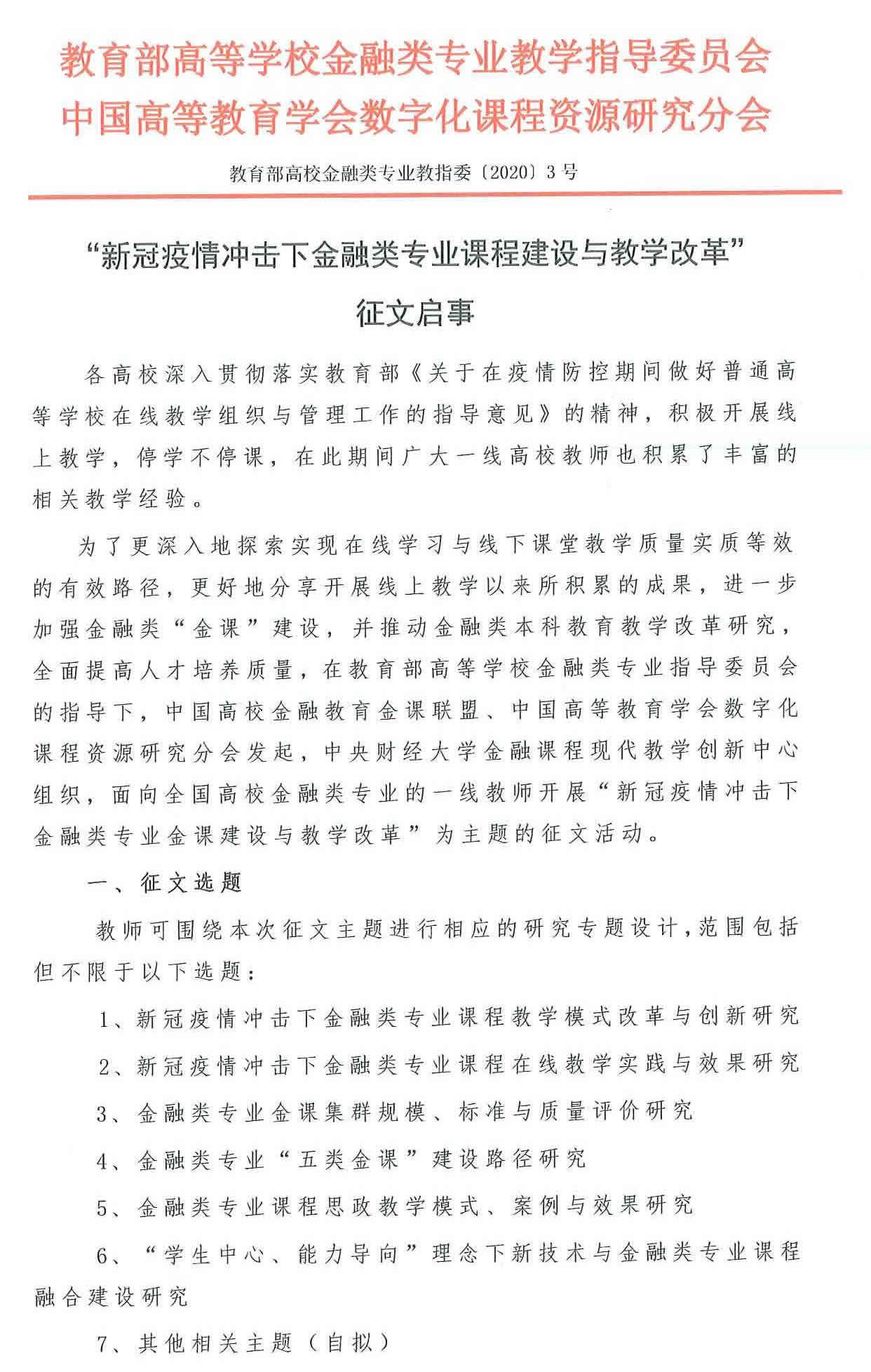 “新冠疫情冲击下金融类专业课程建设与教学改革”征文启事