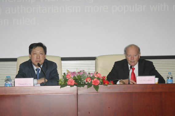 此次讲座围绕一国的发展战略和改革策略展开了讨论。约翰.威廉姆森教授在上世纪80年代曾提出了华盛顿共识,其成为发展中国家转轨的指导性建议。然而,中国却采取了另一种发展战略,被《时代周刊》主编雷默称之为“北京共识”。约翰.威廉姆森教授首先肯定了中国近20年来的发展成就:中国经济快速发展、贫困化程度降低以及快速从金融危机中复苏,这些成就令世界所瞩目。随后,约翰.威廉姆森教授总结了“北京共识”的主要内容,包括:渐进主义的改革模式、创新的价值、发挥外需的作用、国家资本主义,以及集权化倾向,并认为中国的改革战略尽管是成功的,但应该注意其消耗的成本,其中,创新、依靠外需的战略都需要消耗很多的资源,中国应该注意这种模式的可持续性。约翰·威廉姆森教授认为,中国的改革仍然需要逐步走向自由和开放。