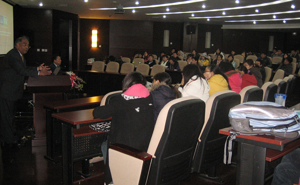 张礼卿教授首先代表学校对 Prema-chandra Athukorala 教授的到来表示欢迎,并对其学术背景做了简要介绍。 Prema-chandra Athukorala 教授的讲座主要围绕全球生产分享和国际贸易中价格弹性的度量两方面内容展开。在全球生产分享部分, Prema-chandra Athukorala 教授讲述了二战后国际贸易发展的三个阶段并以生动的实例说明包括组件生产、装配、外包和最终组装的全面的生产网络已包括几乎所有国家。第二部分中, Prema-chandra Athukorala 教授提出用标准进口方程度量国际贸易中的价格弹性。
