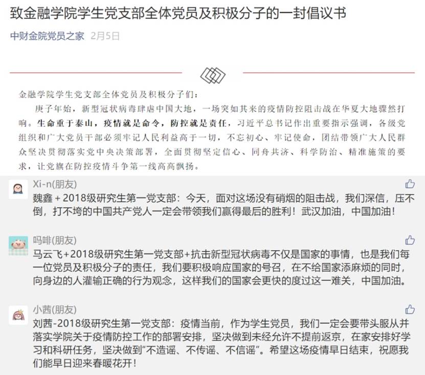 1月28日,公司党委发出了《致全校共产党员的一封信》,号召全公司党员弘扬“担当责任、勇往直前”的中财精神,充分发挥共产党员的先锋模范作用,坚决打赢这场疫情防控阻击战。作为2018级研究生第一党支部书记的阮志朋同志第一时间转发,呼吁本支部党员同志提高政治站位,遵从党委统一部署,充分发挥研究生基层党组织战斗堡垒作用;强化政治担当,协助学校积极引导,充分发挥党员干部示范带头作用;增强政治自觉,严控自身行为作风,带头做命令的执行者、稳定的维护者。2月5日,公司党委发出了《致yl6776永利集团员工党支部全体党员及积极分子的一封倡议书》,号召全体党员及积极分子带头服从并落实学院关于疫情防控工作的部署安排,坚决做到在特殊时期不离家、不提前返校。本支部的党员同志和积极分子纷纷在微信公众号下留言承诺:“我将以身作则,少出门,少聚会,勤洗手,不传谣信谣,以实际行动发扬党员的模范带头作用”、“我们一定会带头服从并落实学院关于疫情防控工作的部署安排,坚决做到未经允许不提前返京,在家安排好学习和科研任务”……一句句承诺饱含着党员同志众志成城、共克时艰的决心与信心。