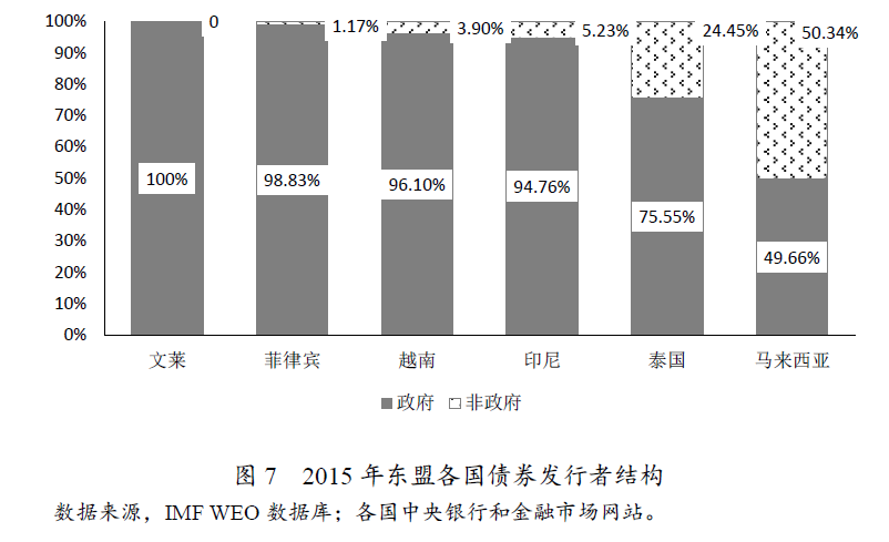 除了新加坡外,各东盟国家的债券市场筹资者结构中,政府发行债券占比都比较高,体现了政府在经济发展中具有较强的支配力。